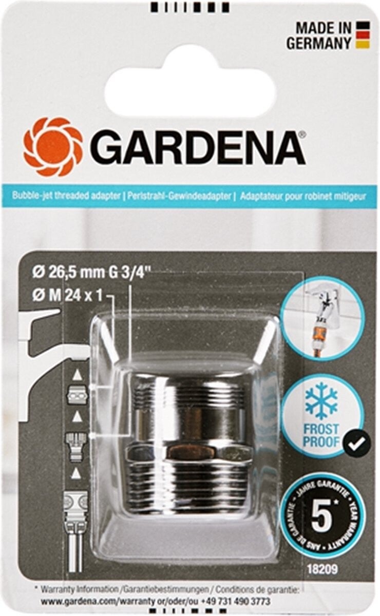 De GARDENA Schroefadapter voor zachte bruisstraal is perfect geschikt voor het aansluiten van het GARDENA System op een keuken- of badkamerkraan. De lengte past perfect bij moderne binnenkranen. Dankzij deze adapter kan de originele GARENA-adapter voor binnenkranen snel worden bevestigd en losgemaakt. Met M 24 x 1 en 26.5 mm (G 3/4") buitendraad.
