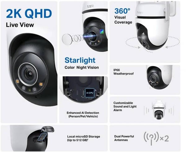 - Liveweergave in 2K QHD – met een resolutie van 2560 × 1440 levert Tapo C520WS 1,7 keer meer pixels en duidelijkere beelden dan 1080p.