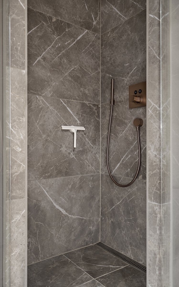 Douchekrabber van volledig gegoten silicone zonder roestende metalen oppervlakken. De doucheschraper maakt het gemakkelijk om water van gladde oppervlakken te verwijderen. Het functionele en eenvoudige ontwerp is een plezier om te gebruiken en esthetisch mooi - en het is ook hygiënisch. De schraper zit in een magnetische houder die gemakkelijk te bevestigen is met 3M tape. De schraper zit in een magnetische houder die gemakkelijk te bevestigen is met 3M tape.