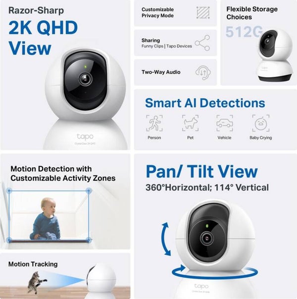 De TP-Link Tapo C220 is een beveiligingscamera voor indoor/binnen gebruik met een 2K 4MP QHD resolutie ( 2560x1440 px)