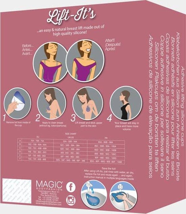 1 jaar garantieDe MAGIC Lift-it’s zijn volledig onzichtbare siliconen cups die je borsten een ligt geven zonder een bh te dragen. Deze backless solutions is ideaal voor lage en diep uitgesneden outfits.