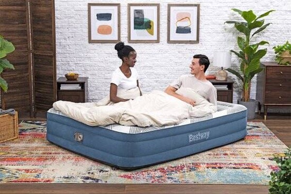 Wat zit er in de set? Tweepersoons Bestway matras met afmetingen: 203 x 152 x 36 cm, ingebouwde elektrische pomp, speciale tas, reparatiepleister.