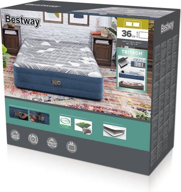 Waarom zijn Bestway matrassen zo comfortabel en duurzaam? TRITECH-technologie duurzaam, drielaags materiaal Dankzij het gebruik van duurzaam, drielaags materiaal kunt u er zeker van zijn dat het matras jarenlang meegaat zonder zijn elasticiteit en duurzaamheid te verliezen. I-balkframe - comfort Technologie Intern frame, voor optimaal comfort Het interne frame zorgt voor de stabiliteit van de matras. Bestway matrassen maken gebruik van geavanceerde I-balktechnologie, waarbij de onder- en bovenkant van de matras met horizontale stroken met elkaar worden verbonden. Ingebouwde elektrische pomp Pomp ingebouwd in de matras - even geduld en de matras is klaar om te slapen!