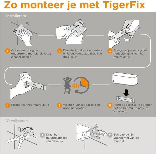 Met TigerFix zijn Tiger accessoires snel en eenvoudig op een gladde, harde ondergrond te bevestigen door middel van een gepatenteerd lijmsysteem. Je badkamer verfraaien met Tiger accessoires was nog nooit zo eenvoudig. Na het mixen van de lijm kan deze eenvoudig op het muurplaatje worden aangebracht en na 4 uur kun je het accessoire plaatsen. Zo simpel is het! Wil je geen gaten boren in je nieuwe badkamertegels, zeker niet in natuursteen of grote tegels? Dan is TigerFix de oplossing. Deze gepatenteerde manier van monteren garandeert een zeer krachtige lijmverbinding op iedere gladde, stevige ondergrond. Groot voordeel van TigerFix is dat het muurplaatje eenvoudig, zonder beschadigingen, te verwijderen is. Handig bij huurwoningen, verhuizen of gewoon wanneer je accessoires wilt verplaatsen. TigerFix is geschikt voor nagenoeg alle accessoires uit de Tiger series en kun je herkennen aan het Tigerfix symbool op de verpakking.