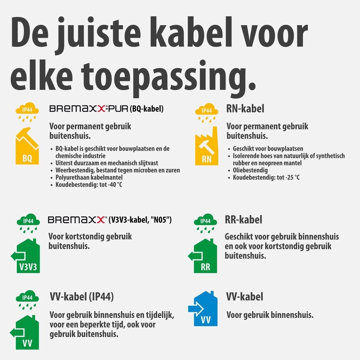 - Robuuste stroomverlengkabel met 25 m Bremaxx-kabel (AT-N05V3V3-F 3G1,5) - kan worden gebruikt tot -35 °C, UV-bestendig en mechanisch zeer veerkrachtig
