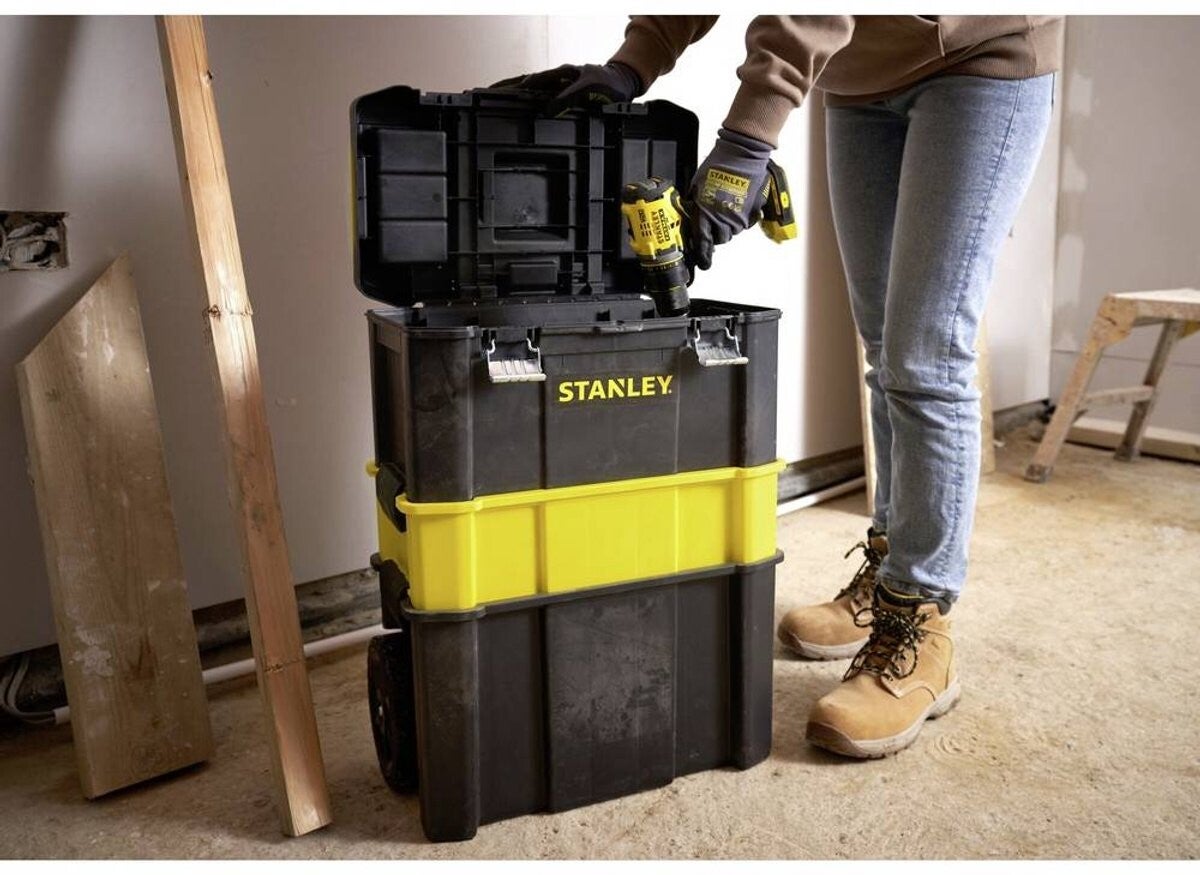 De STST1-80151 STANLEY Gereedschapswagen Essential 3-in-1 maakt het mogelijk allerlei soorten gereedschap eenvoudig en veilig op te bergen: van kleine onderdelen en accessoires tot groot en elektrisch gereedschap. De gereedschapswagen bestaat uit meerdere los te koppelen onderdelen van verschillende dieptes voor een optimale, geordende opberging van alle gereedschappen.