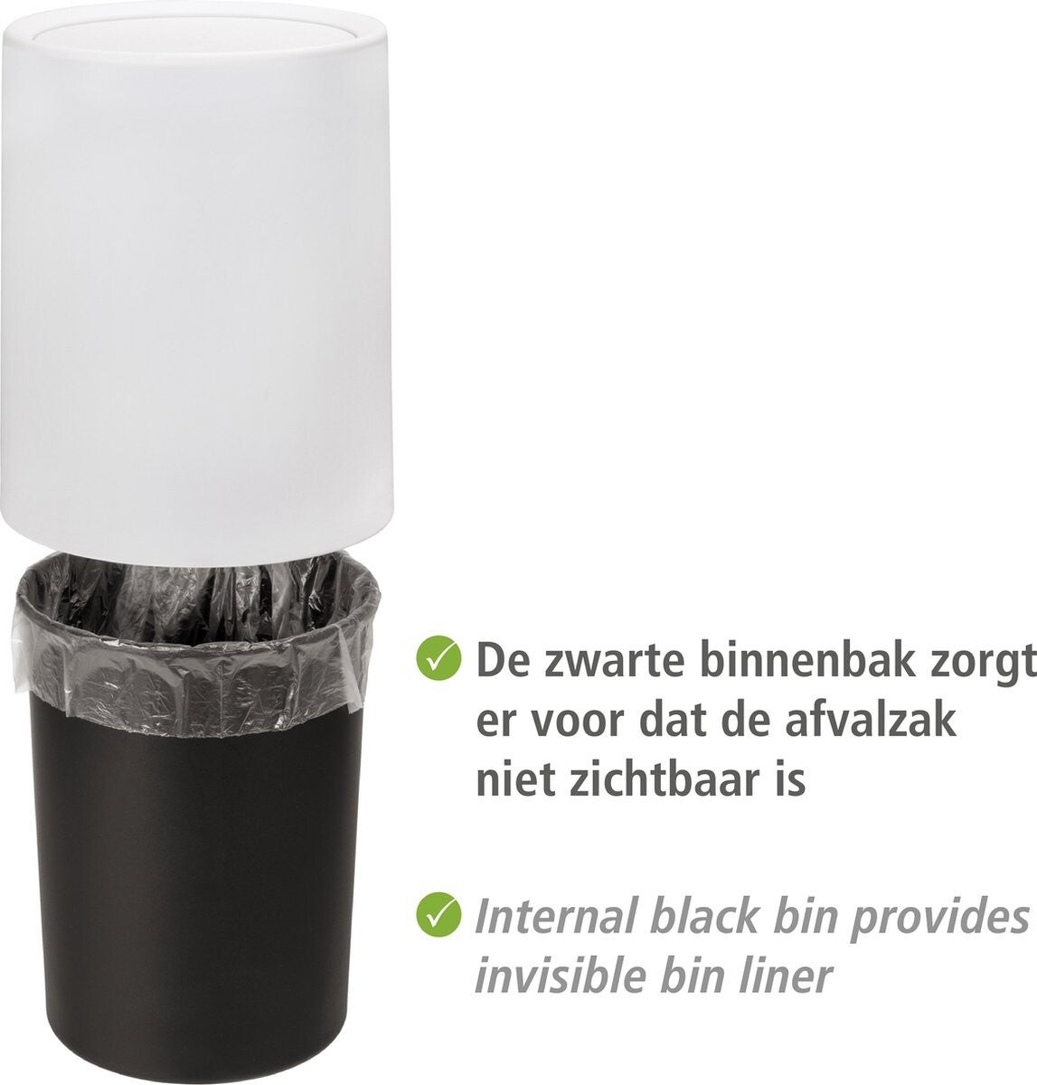 De vuilniszak (niet meegeleverd) en het vuil dat in de prullenbak zit, zijn zo dus van buitenaf niet zichtbaar.